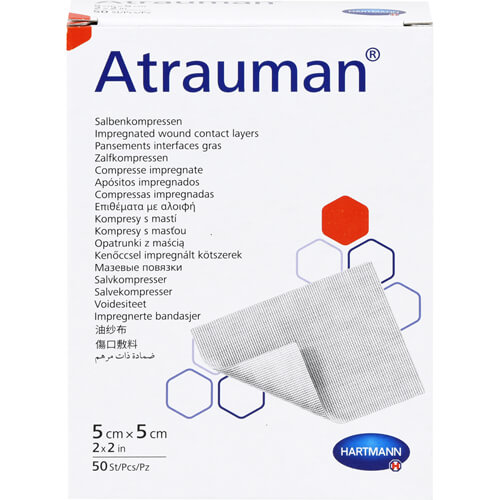 Bei Atrauman handelt es sich um sterile, wirkstofffreie Salbenkompressen für den Einmalgebrauch zur Behandlung von oberflächlichen akuten und chronischen Wunden jeglicher Art. Als nicht verklebende Wundkontaktschicht ist der Verband besonders geeignet, um ein Verkleben des Sekundärverbands mit dem Wundbett zu vermeiden, außerdem sorgt er dafür, dass die Wundränder und die Umgebungshaut geschmeidig bleiben. Durch die neutralen Eigenschaften der wirkstofffreien Salbenmasse ist Atrauman besonders gut in der Dermatologie sowie bei haut- und medikamentenempfindlichen Patienten anwendbar.