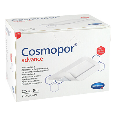COSMOPOR Advance Wundverband 5x7,2 cm (25St)Einheit: 25 St Pflaster(Abbildung ähnlich, von PZN 3546509) Firma: ToRa Pharma Kontaktdaten Kategorie: Verbandstoffe » Pflaster Bestellnummer (PZN): 19533319 PDF-Dokumente: unser Shop-Angebot: