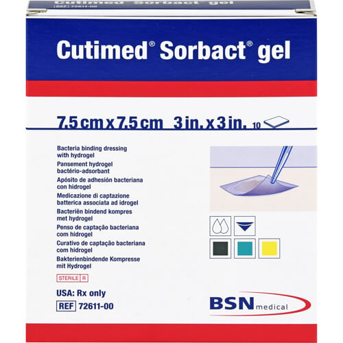 Cutimed Sorbact Gel ist eine hydrogelgetränkte keimreduzierende Wundauflage. Sie reinigt die Wunde von Belägen und nekrotischem Gewebe und verringert die Keimzahl in der Wunde auf Basis des Prinzips der hydrophoben Wechselwirkung: Die spezielle Sorbact-Beschichtung verleiht dem Produkt starke hydrophobe (wasserabweisende) Eigenschaften. Viele pathogene Bakterien und Pilze sind von Natur aus hydrophob und binden sich deshalb irreversibel an die Wundauflage. So wird mit jedem Verbandwechsel die Keimzahl in der Wunde reduziert und optimale Bedingungen für den natürlichen Wundheilungsprozess geschaffen.