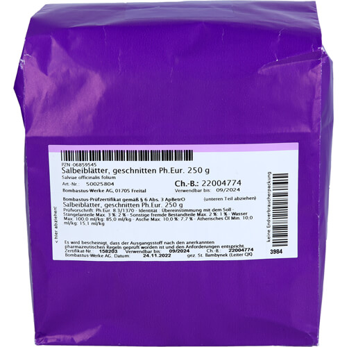 FOLIA SALVIAE officinalis conc.DAB 10 (250g)weiterer Name: Salbeiblätter geschnitten Firma: Bombastus-Werke Kontaktdaten Kategorie: Apothekenbedarf, Rezeptur » Pflanzendrogen, Chemikalien Bestellnummer (PZN): 6859545 Biozidprodukte vorsichtig verwenden. Vor Gebrauch stets Etikett und Produktinformationen lesen. PDF-Dokumente: unser Preis: