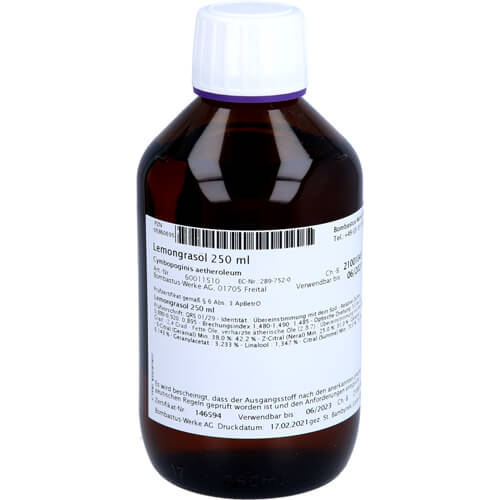 Diesen Artikel bestellen: Preise inkl. 19% MwSt. und ggf. zuzügl. Versandkosten Verwandte Shop-Artikel: weitere Packungsgrößen von Lemongrasöl: 10ml 50ml 100ml alle Artikel von Bombastus-Werke (455) Warengruppe: Pflanzendrogen, Chemikalien (2992) Kategorie: Lemongrasöl Hersteller-Produktinformationen