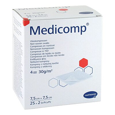 MEDICOMP Vlieskomp.steril 7,5x7,5 cm 4fach (25X2St)Einheit: 25X2 St Kompressen Firma: HARTMANN Kontaktdaten Kategorie: Verbandstoffe » Kompressen Bestellnummer (PZN): 16585439 PDF-Dokumente: