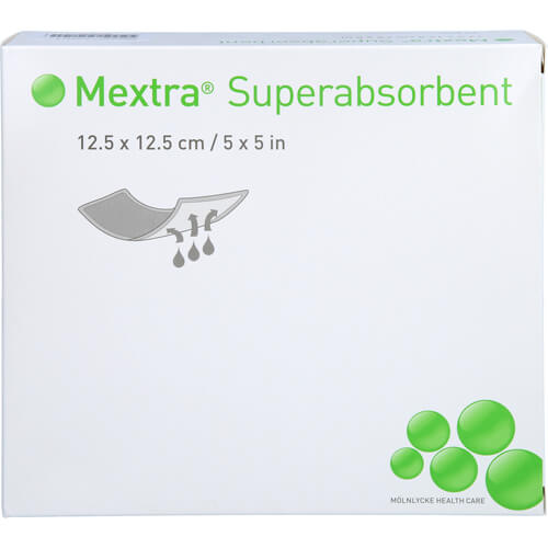 - Mextra Superabsorbent wird mit der weißen Seite zur Wunde hin appliziert und sollte die wundumgebende Haut mindestens 2 cm überlappen. Mextra Superabsorbent kann auch zusammen mit einer Wundkontaktauflage, wie Mepitel, Meptel One und Mepilex Transfer verwendet werden.