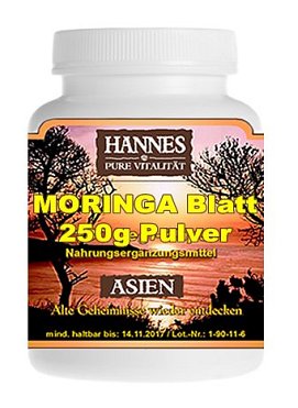 MORINGA BLATT Premium Pulver (250g)Einheit: 250g Pulver Firma: Hannes Pharma Nutricon Kontaktdaten Kategorie: Nahrungsergänzungsmittel Bestellnummer (PZN): 13980997