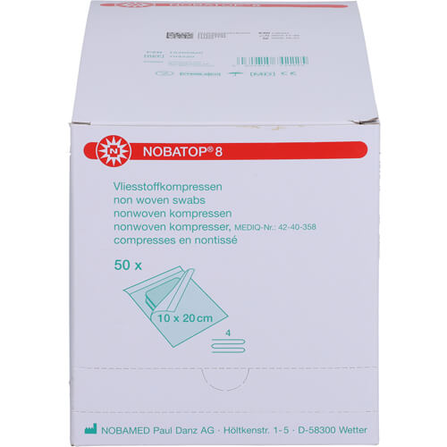 Produktbeschreibung und Zweckbestimmung: Steril verpackte, 4-fach gelegte, bindemittelfreie Vliesstoffkompressen der Größe 10 cm x 20 cm a 10 Stück einzeln verpackt und in einer Sammelpackung mit praktischem Entnahmeschlitz abgepackt. Die Vliesstoffkompressen dienen der allgemeinen Wundversorgung, zur Wundreinigung, zur Wundabdeckung und zum Aufsaugen von Blut und Körperflüssigkeiten. Sie sind für den einmaligen Gebrauch bestimmt. Nobatop steril sind saugfähig, luftdurchlässig, weich und deshalb angenehm auf der Haut.