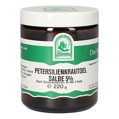 PETERSILIENKRAUTÖL Salbe 5% (220g)Einheit: 220g Salbe Firma: HECHT PHARMA Kontaktdaten Kategorie: Körperpflege » Hautpflege Bestellnummer (PZN): 16761793 PDF-Dokumente: