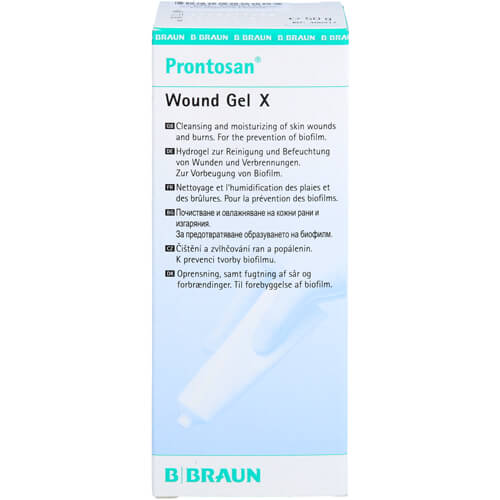 3. Allgemeine Anwendung: Für optimale Resultate sollte zur Reinigung der Wunde und des sie umgebenden Hautareals Prontosan Wundspüllösung verwendet werden, bevor dann der Auftrag von Prontosan Wundgel X erfolgt. Prontosan Wundgel X sollte reichlich auf das Wundbett aufgetragen werden. Kavitäten und Taschen sind mit Prontosan Wundgel zu füllen. Wundauflagen, Mullzuschnitte, Kompressen oder andere, absorptionsfähige Materialien können vor dem Legen des Verbands mit Prontosan Wundgel X befeuchtet werden. Prontosan Wundgel X kann bis zum nächsten Verbandswechsel auf der Wunde belassen werden. Je nach Häufigkeit des Verbandswechsels werden unterschiedliche Mengen Prontosan Wundgel X aufgetragen. Die Wundoberfläche sollte kontinuierlich feucht gehalten werden, um eine ausreichende Reinigung und Desinfektion sicherzustellen. Ablagerungen werden mit dem nächsten Verbandswechsel sanft abgelöst und entfernt. Der Auftrag sollte häufig genug vorgenommen werden, sodass alle Ablagerungen und nekrotischen Rückstände leicht entfernt werden können und das Wundbett optimal vorbereitet ist. Prontosan Wundgel X sollte nicht mehr als 30 aufeinanderfolgende Tage auf der Wunde verbleiben. 4. Gewebeverträglichkeit und biologische Kompatibilität: Dermatologisch getestet und als nicht irritativ und gut verträglich eingestuft. Schmerzfrei anwendbar. Keine Hemmung der Granulation und Epithelisierung. 5. Nebenwirkungen: In sehr seltenen Fällen kann nach Aufträgen von Prontosan ein leichtes Brennen auftreten, welches jedoch in der Regel nach wenigen Minuten wieder verschwindet. Prontosan kann allergische Reaktionen wie Juckreiz (Urtikaria) und Hautausschläge (Exanthem) hervorrufen. Sehr selten (weniger als 1 Behandelter von 10.000 ist betroffen) wurde über anaphylaktische Schockreaktionen nach Verwendung von Prontosan Produkten berichtet. 6. Gegenanzeigen: Prontosan sollte nicht angewendet werden: