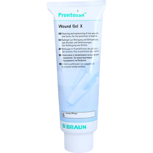 3. Allgemeine Anwendung: Für optimale Resultate sollte zur Reinigung der Wunde und des sie umgebenden Hautareals Prontosan Wundspüllösung verwendet werden, bevor dann der Auftrag von Prontosan Wundgel X erfolgt. Prontosan Wundgel X sollte reichlich auf das Wundbett aufgetragen werden. Kavitäten und Taschen sind mit Prontosan Wundgel zu füllen. Wundauflagen, Mullzuschnitte, Kompressen oder andere, absorptionsfähige Materialien können vor dem Legen des Verbands mit Prontosan Wundgel X befeuchtet werden. Prontosan Wundgel X kann bis zum nächsten Verbandswechsel auf der Wunde belassen werden. Je nach Häufigkeit des Verbandswechsels werden unterschiedliche Mengen Prontosan Wundgel X aufgetragen. Die Wundoberfläche sollte kontinuierlich feucht gehalten werden, um eine ausreichende Reinigung und Desinfektion sicherzustellen. Ablagerungen werden mit dem nächsten Verbandswechsel sanft abgelöst und entfernt. Der Auftrag sollte häufig genug vorgenommen werden, sodass alle Ablagerungen und nekrotischen Rückstände leicht entfernt werden können und das Wundbett optimal vorbereitet ist. Prontosan Wundgel X sollte nicht mehr als 30 aufeinanderfolgende Tage auf der Wunde verbleiben. 4. Gewebeverträglichkeit und biologische Kompatibilität: Dermatologisch getestet und als nicht irritativ und gut verträglich eingestuft. Schmerzfrei anwendbar. Keine Hemmung der Granulation und Epithelisierung. 5. Nebenwirkungen: In sehr seltenen Fällen kann nach Aufträgen von Prontosan ein leichtes Brennen auftreten, welches jedoch in der Regel nach wenigen Minuten wieder verschwindet. Prontosan kann allergische Reaktionen wie Juckreiz (Urtikaria) und Hautausschläge (Exanthem) hervorrufen. Sehr selten (weniger als 1 Behandelter von 10.000 ist betroffen) wurde über anaphylaktische Schockreaktionen nach Verwendung von Prontosan Produkten berichtet. 6. Gegenanzeigen: Prontosan sollte nicht angewendet werden: